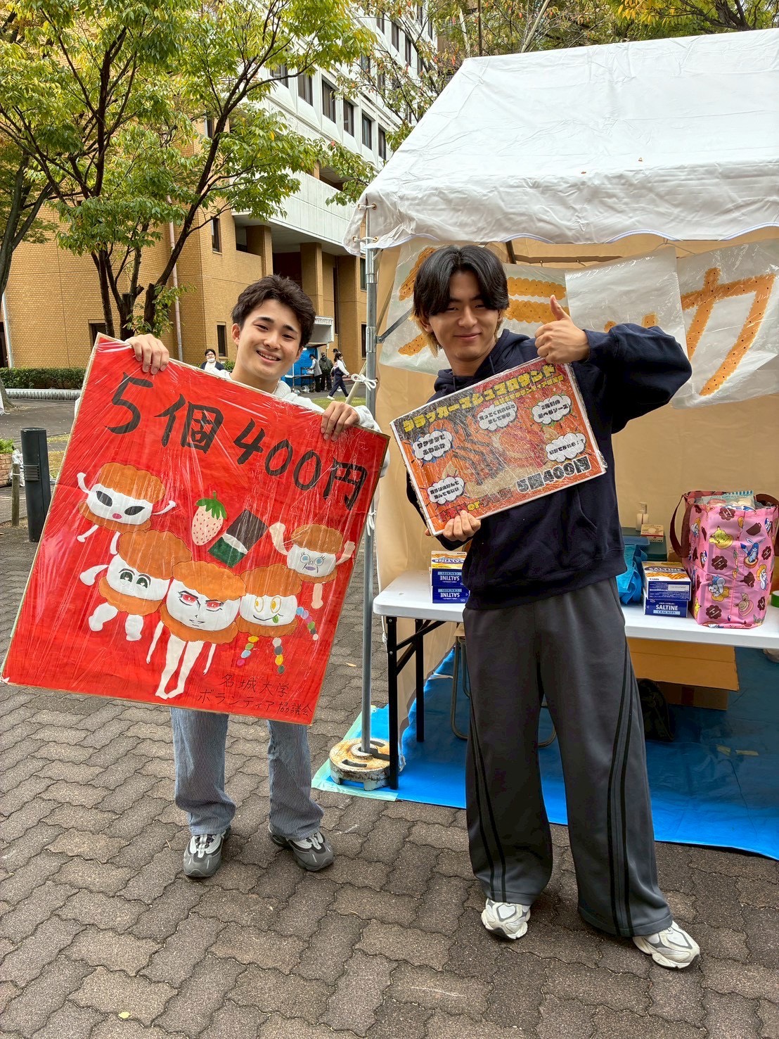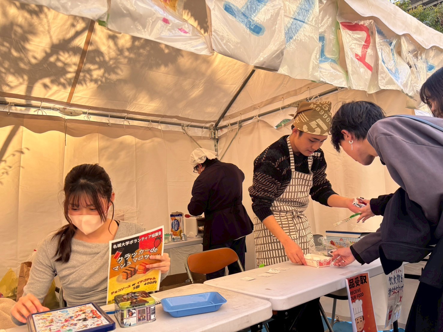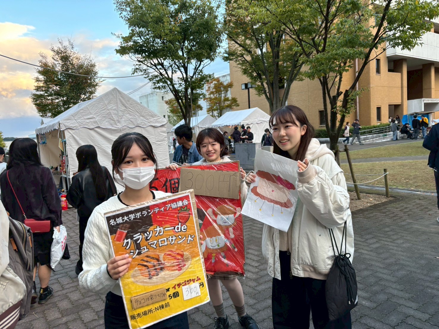 今年度の名城大学の大学祭でボランティア協議会は、クラッカーマシュマロサンドへというクラッカーでマシュマロを挟んだお菓子を販売しました!運営を手伝ってくださった皆さんと協力し、無事300食売り切ることができました!!