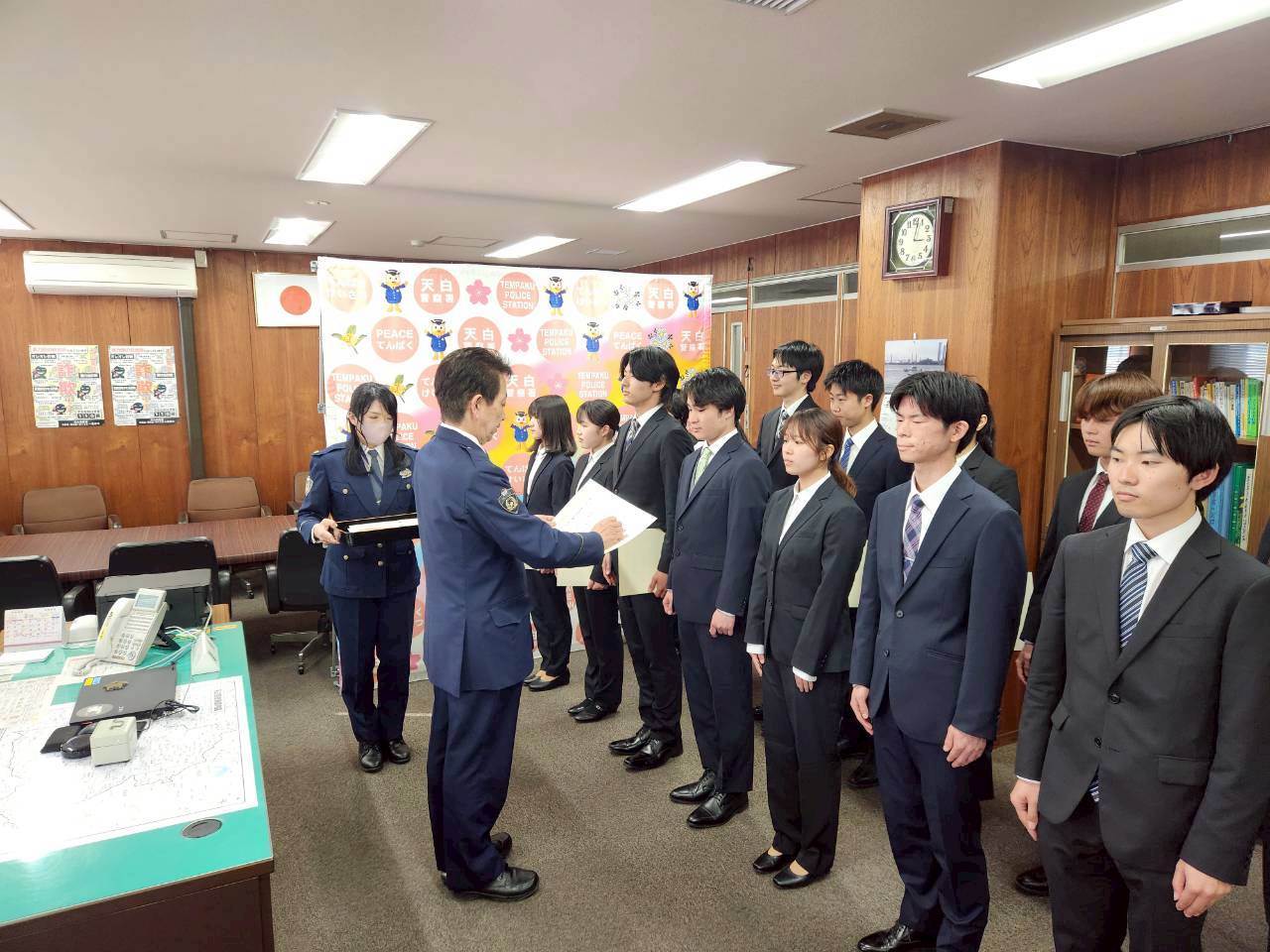 ニュース一覧 天白警察署長表彰 ボランティア協議会広報部門 2026年2月26日 2月26日、天白警察署にて、令和7年度に地域安全パトロール部門の活動に多く参加した学生へ感謝状が授与されました。 本部門では、・大坪小学校でのふれあい挨拶運動・大学周辺地域での防犯パトロール・天白警察署や天白区役所の方々と連携した交通安全啓発活動 などを行っています。 今回は15名が受賞し、過去最多の受賞者数となりました! 令和8年度も様々な活動を予定しています。皆さんのご参加をお待ちしています!! 著者について ボランティア協議会広報部門 Administrator ウェブサイトにアクセスしてください すべての投稿を表示します Bluesky Post navigation Previous: 第19回はまらいんや!大島Next: つごもり大市 コメントを残す コメントをキャンセルメールアドレスが公開されることはありません。 ※ が付いている欄は必須項目ですコメント ※ 名前 ※ メール ※ サイト 次回のコメントで使用するためブラウザーに自分の名前、メールアドレス、サイトを保存する。 Δ 関連するストーリー ニュース一覧 城端コネクト総会 ボランティア協議会広報部門 2026年4月4日 ニュース一覧 能登半島災害ボランティア ボランティア協議会広報部門 2026年3月19日 ニュース一覧 総会 ボランティア協議会広報部門 2026年3月15日