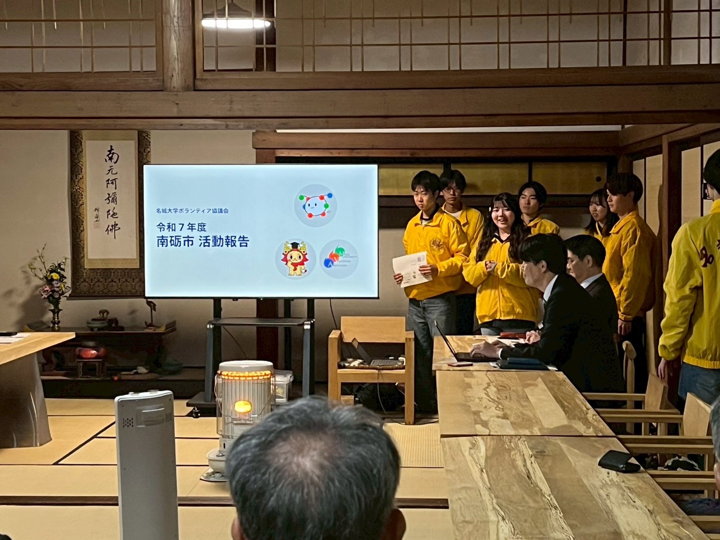 本報告会では、本年度に南砺市で実施してきた各種活動の成果について振り返りを行いました。令和7年度は、城端曳山祭やむぎや祭、ふるさと寺子屋など、例年以上に多くの地域行事に参加させていただき、地域の皆様との交流を深めることができました。年間の活動実績は、延べ参加者数513名、宿泊数は合計850泊にのぼり、南砺市と共に歩んだ一年となりました。